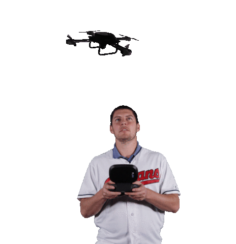 Trevor Bauer, wearing a Cleveland Indians jersey, skillfully controls a drone, looking up as it hovers above him.