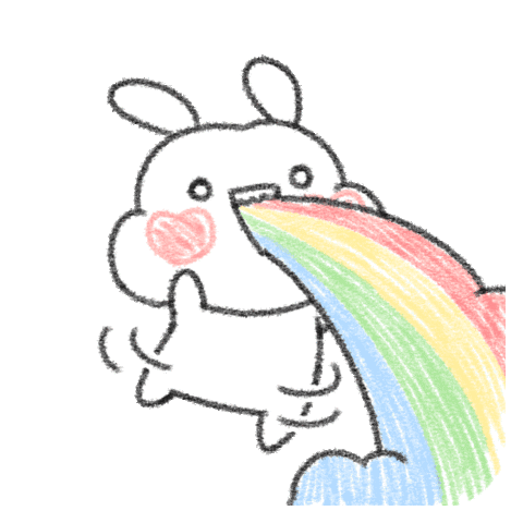 A cute, dizzy bunny character sits, whimsically expelling a vibrant rainbow stream, conveying a feeling of lightheadedness.