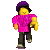 a pixel art of a person wearing a pink shirt and a purple hat walking .