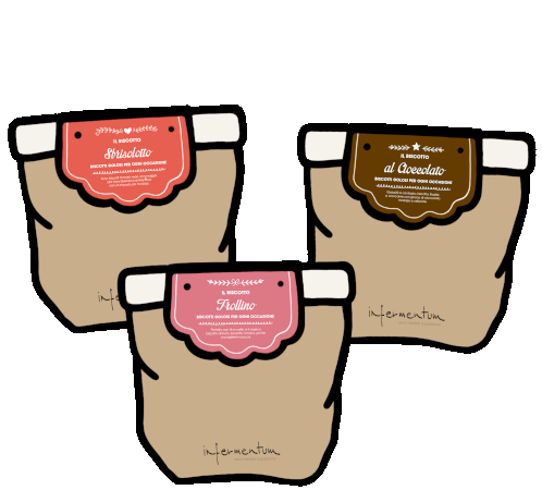 Animated sticker featuring three Infermentum biscuit bags: Shisolatto, al Cioccolato, and Frollino, with Italian text.
