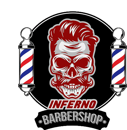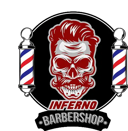 A striking logo sticker featuring a red skull with a pompadour, flanked by classic barber poles, for Inferno Barbershop.