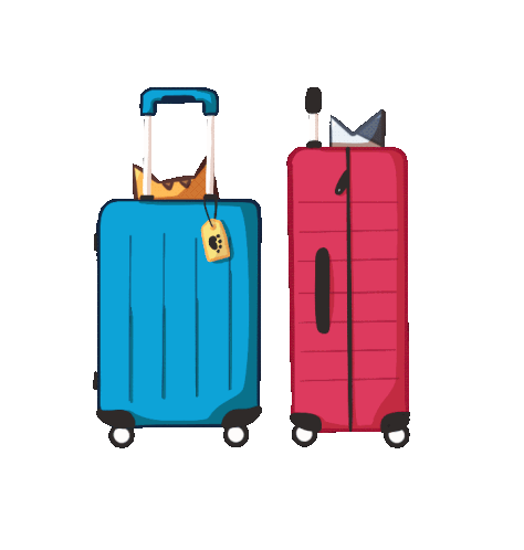 Inky and Peete, two adorable cats, peek out from blue and red suitcases, ready for an exciting journey.