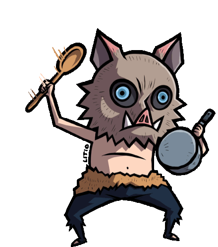 Inosuke from Kimetsu No Yaiba, wearing his iconic boar mask, holds a wooden spoon and a pan in a determined protest stance.