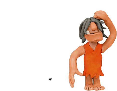 A claymation caveman from Curiosamente is annoyed as a small bug crawls on his head and arm.