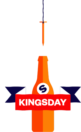 An orange bottle with a 'KINGSDAY' banner and an 'S' logo, as a nail attempts to be inserted but fails, referencing the Dutch game spijkerpoepen.