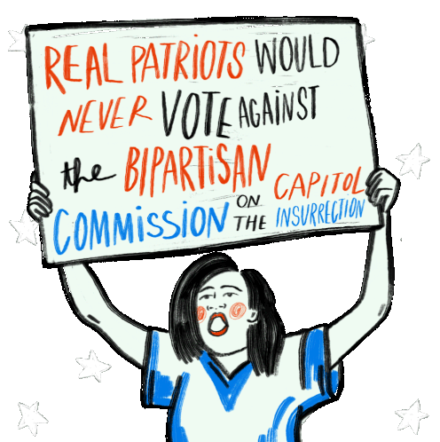 A woman holds a protest sign stating 'Real Patriots Would Never Vote Against the Bipartisan Commission on Capitol Insurrection'.