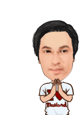 A cartoon character with a big head and a 'Thailand' shirt performs a 'wai' greeting with an 'interesting' expression.