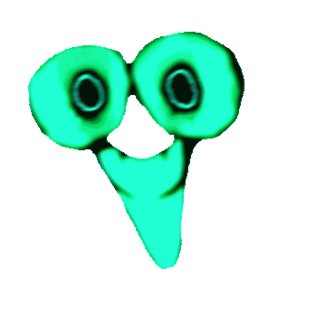 A green, cartoonish face with large eyes and a pointed chin, resembling a character from Interminable Rooms Xe-1.