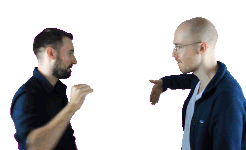 Two men attempt an elbow bump, then a handshake, and finally a hug, creating an awkward but friendly greeting.
