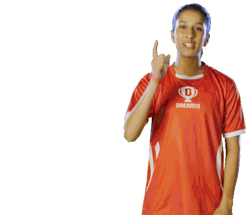 Jemimah Rodrigues, wearing a Dream11 IPL jersey, points her finger upwards with a thoughtful expression.