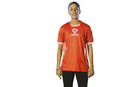 Jemimah Rodrigues, an Indian cricketer, smiles and points forward in her red Dream11 IPL jersey, showing enthusiasm.