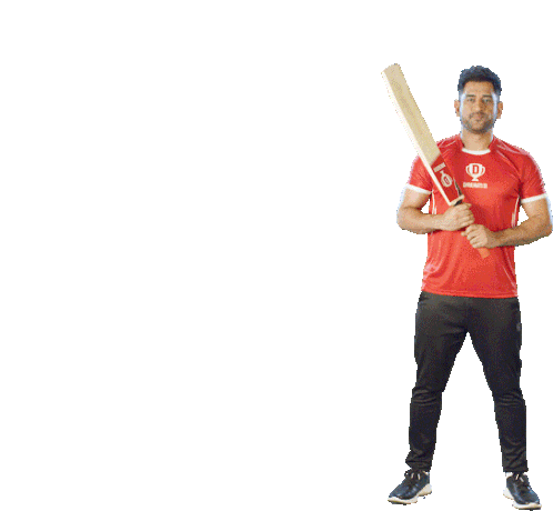 MS Dhoni, the legendary Indian cricketer, smiles while holding a cricket bat, wearing his red Dream11 IPL jersey.
