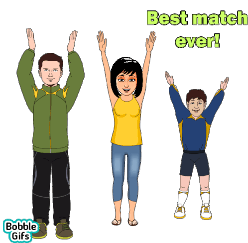 Animated sticker showing three people celebrating a 'Best match ever!' win, perfect for IPL cricket fans.