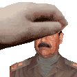 A humorous sticker featuring Saddam Hussein, as a hand gently places a hat on his head in a 'patpatpat' motion.