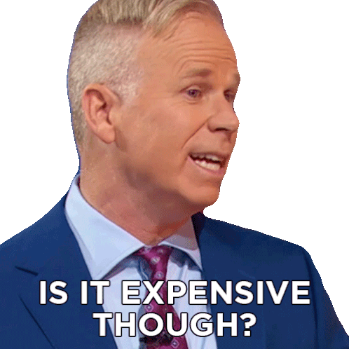 Gerry Dee, the Canadian comedian, questions the cost with a direct 'Is it expensive though?' expression.
