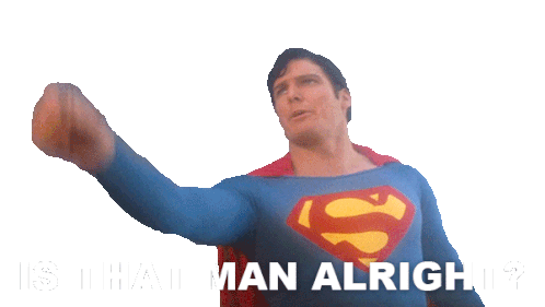 Christopher Reeve as Superman looks concerned, asking 'Is That Man Alright?' in this iconic moment from Superman The Movie.