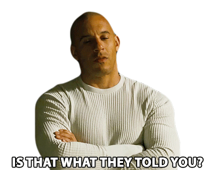 Vin Diesel as Dominic Toretto questions information with a skeptical look, asking "Is that what they told you?".