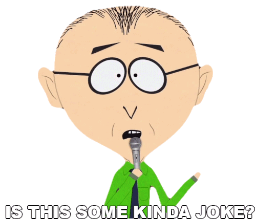 Mr. Mackey from South Park, holding a microphone, asks 'Is This Some Kinda Joke?' with a surprised expression.