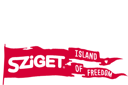 A vibrant red and white flag proudly displaying 'SZIGET ISLAND OF FREEDOM', representing the famous Sziget Festival.