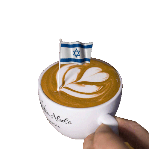 A coffee cup with heart latte art and an Israeli flag, by Dritan Alsela, celebrating national pride.