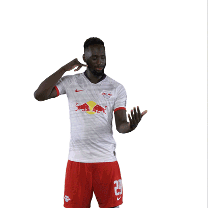 Footballer Jean Kevin Augustin makes a 'call me' gesture, asking 'Is anyone there?' while wearing his RB Leipzig kit.