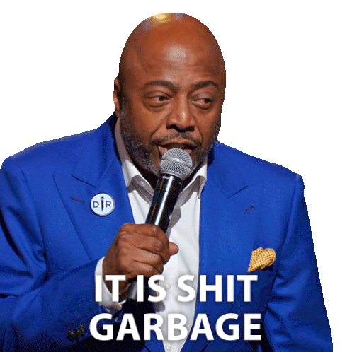 Comedian Donnell Rawlings passionately declares 'It is shit garbage' into a microphone, expressing strong disapproval.