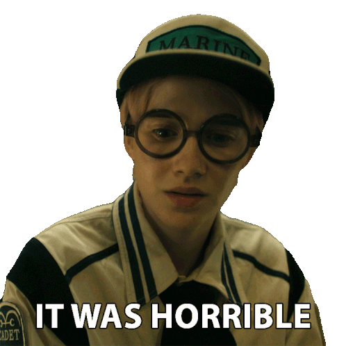Koby, played by Morgan Davies, reacts with a look of dismay, stating 'It was horrible' from the Netflix One Piece series.