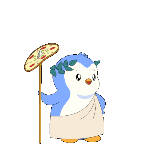 a penguin with a laurel wreath on its head is holding a spear and a slice of pizza flying in the air