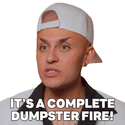 Daya Betty from RuPaul's Drag Race exclaims 'It's a complete dumpster fire!' with a dramatic expression, perfect for chaotic situations.