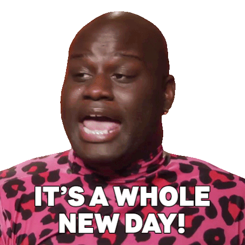 Lala Ri from RuPaul's Drag Race All Stars exclaims 'It's a whole new day!' with an expressive, hopeful look.