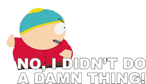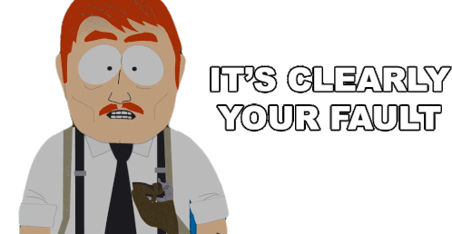 Detective Harris from South Park points and declares 'It's Clearly Your Fault' in this animated sticker.