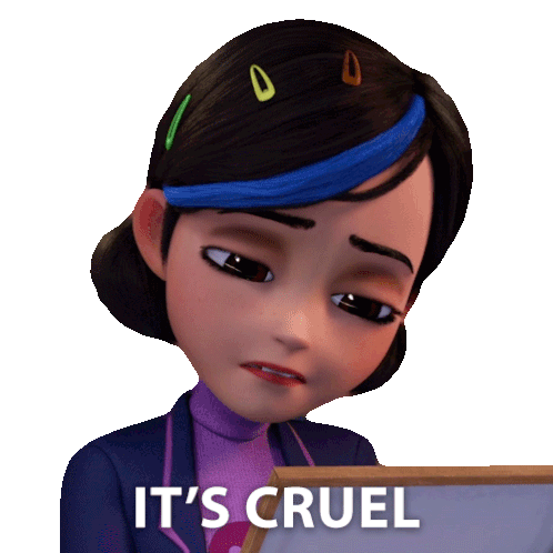 Claire Nunez from Trollhunters cries with tears, expressing sadness and the caption 'IT'S CRUEL' appears.