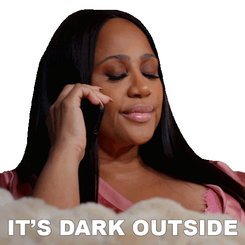 Pam from BET's Sistas, with a phone to her ear, dramatically exclaims 'It's Dark Outside' in this expressive sticker.