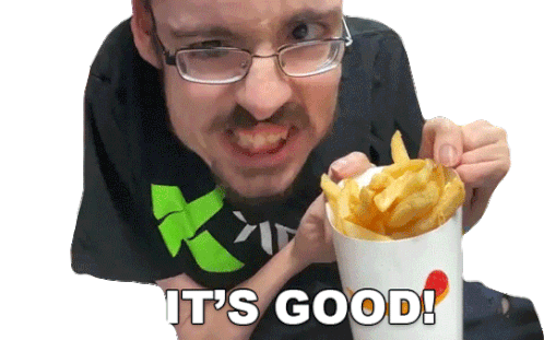 Ricky Berwick enthusiastically holds up a cup of french fries, exclaiming "It's Good!" with a happy expression.