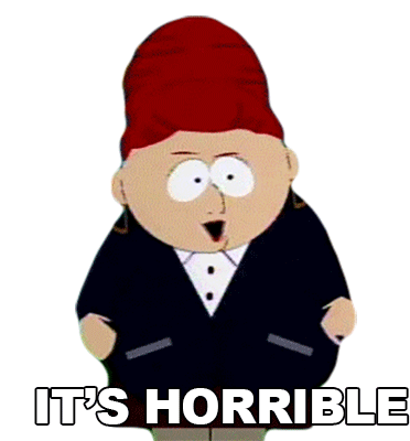 Sheila Broflovski from South Park reacts with shock, exclaiming 'IT'S HORRIBLE' with a wide-eyed expression.