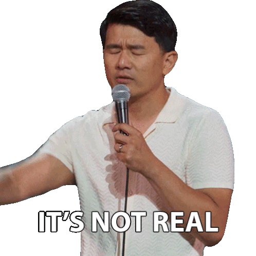 Ronny Chieng, the comedian, emphatically states 'It's Not Real' into a microphone with a serious expression.