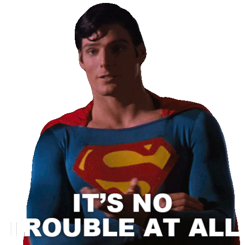 Christopher Reeve as Superman reassures with a confident gesture, saying 'It's No Trouble At All'.