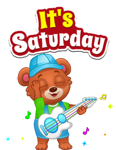 a cartoon of a teddy bear playing a guitar with the words it 's saturday behind him