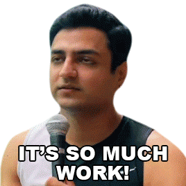Kenny Sebastian, holding a microphone, expresses "IT'S SO MUCH WORK!" with a relatable, tired expression.