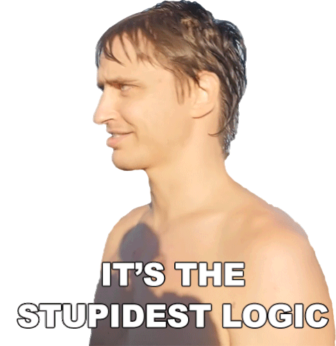 Danny Mullen, shirtless with wet hair, reacts to 'It's The Stupidest Logic' text, expressing disbelief or frustration.