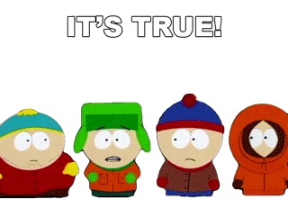Eric Cartman, Kyle Broflovski, Stan Marsh, and Kenny from South Park react to the text "IT'S TRUE!".