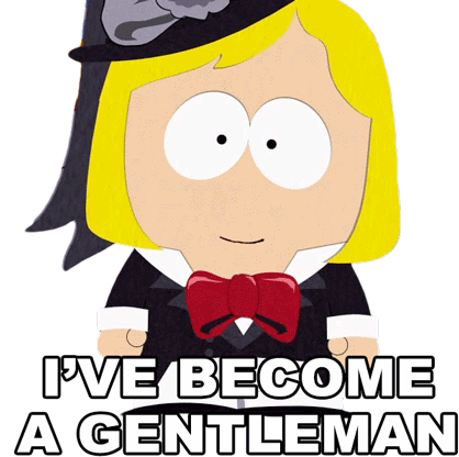 Pip from South Park, dressed as a gentleman, declares "I'VE BECOME A GENTLEMAN" with a changing expression.