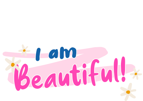 Positive affirmation sticker with 'I am Beautiful!' text in blue and pink, surrounded by cute white flowers.