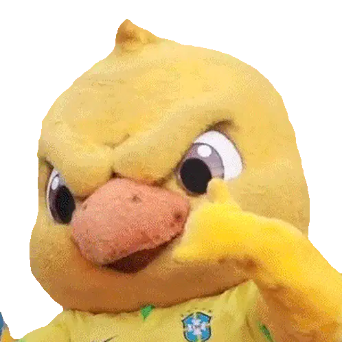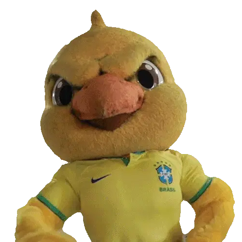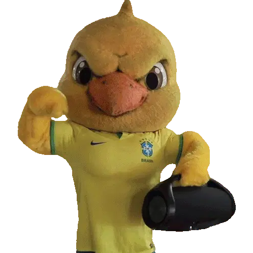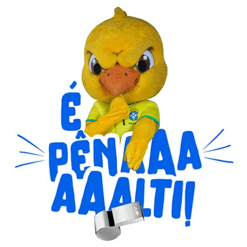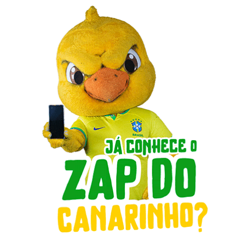 a yellow duck mascot holding a cell phone with the words zap do canarinho
