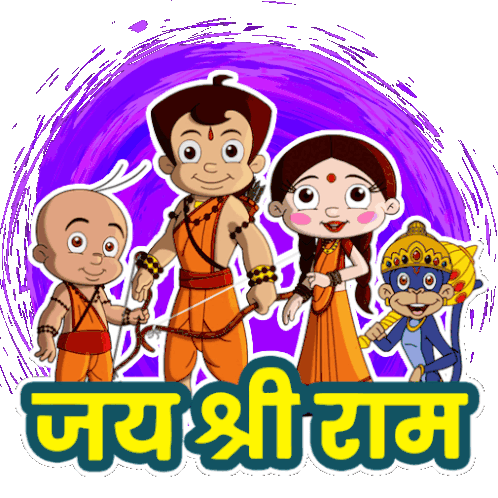 Chhota Bheem, Raju, Chutki, and Jaggu as Ramayana characters with 'Jai Shri Ram' text. A vibrant animated sticker.