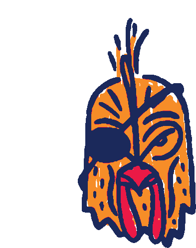 An animated cartoon chicken head, stylized with orange, blue, and red colors, blinks its eye. Perfect for food and fun.