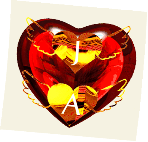 Animated ruby red Jaisini heart art with golden wings and initials J and A, featuring gold accents and a rotating effect.
