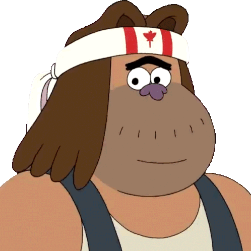 Chad from Clarence with an awkward laugh, wearing a Canadian-themed headband. A funny cartoon reaction.
