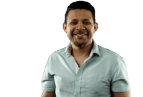 a man in a blue shirt gives a thumbs up sign