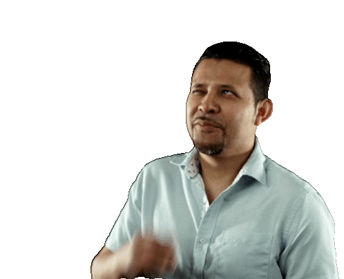 a man in a blue shirt is waving his hand